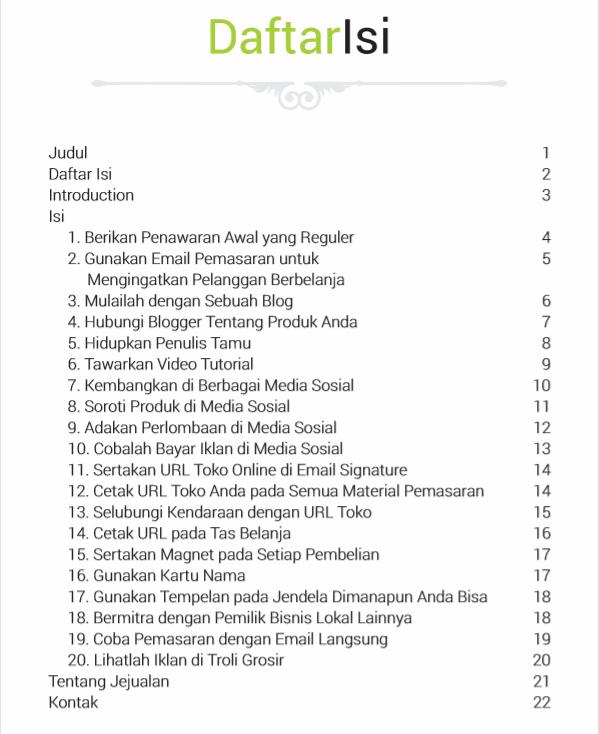 Mulai dari daftar isi kita lihat lengkap dengan 20 Tips Cara Mempromosikan Toko Online yang pasti nya di setiap nomor itu terdapat penjelasan dengan jelas dan kalian semua bisa mengikuti nya, pasti nya mudah bukan dengan kita mengembangkan toko online atau Online Shop ini menggunakan cara yang sudah pasti kalian bisa mendapat keuntungan lebih.